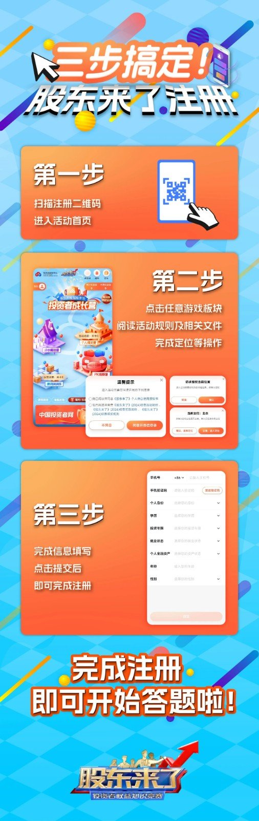 《股東來了》(2024)由中證中小投資者服務中心(簡稱投資者服務中心)聯(lián)合上海、江蘇、西藏、深圳四地證監(jiān)局攜手騰訊集團、芒果超媒共同舉辦。本次活動設置上海、江蘇、西藏、深圳四大片區(qū),覆蓋全國36個賽區(qū)及港澳臺地區(qū),青島賽區(qū)屬于西藏片區(qū)。