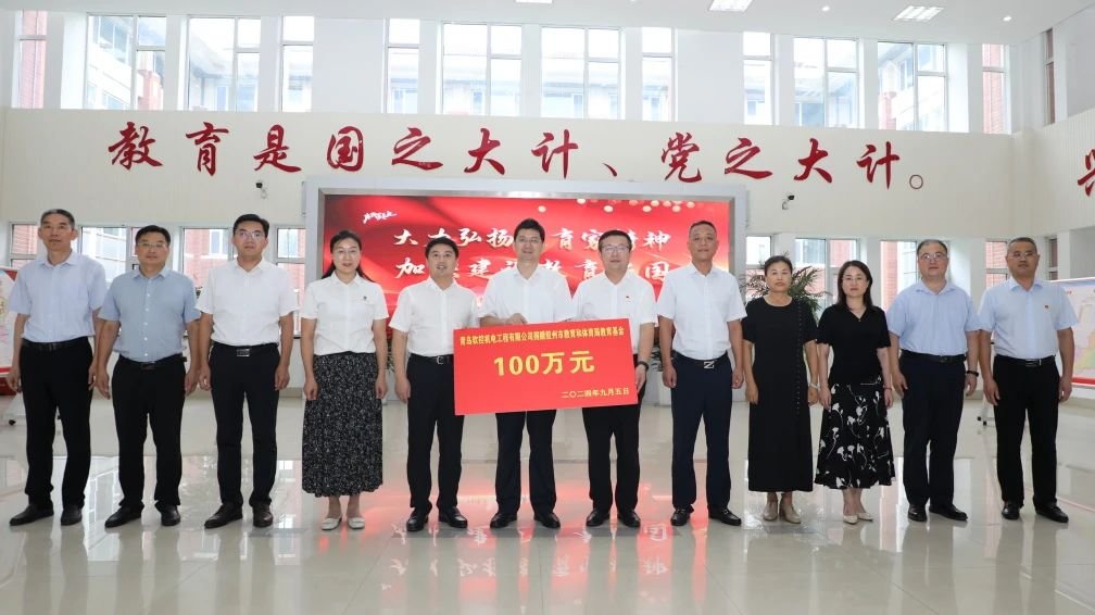 9月5日,在第 40 個教師節(jié)來臨之際,青島軟控機電工程有限公司向膠州市教育和體育局捐贈100萬元,儀式在膠州市教育體育局舉行。膠州市委常委、統(tǒng)戰(zhàn)部部長,市政府副市長董如增出席;膠州市教育和體育局黨組書記、局長、市委教育工委常務副書記尹少杰,青島軟控機電工程有限公司總經理武守濤參加儀式并講話。